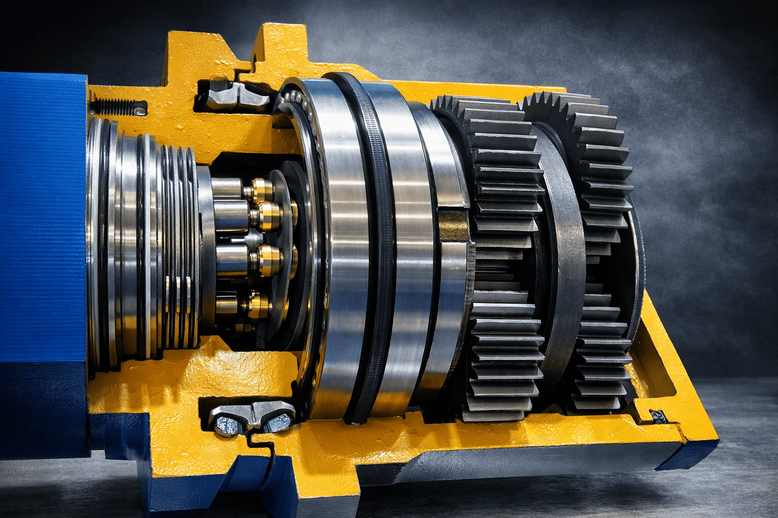 Esta imagen muestra la construcción interna de un mando final y el nivel de precisión con el que se fabrican sus componentes. Cada engranaje, rodamiento y eje debe trabajar con tolerancias exactas para asegurar un funcionamiento estable, reducir fricción y soportar altas cargas en excavadoras y maquinaria pesada.